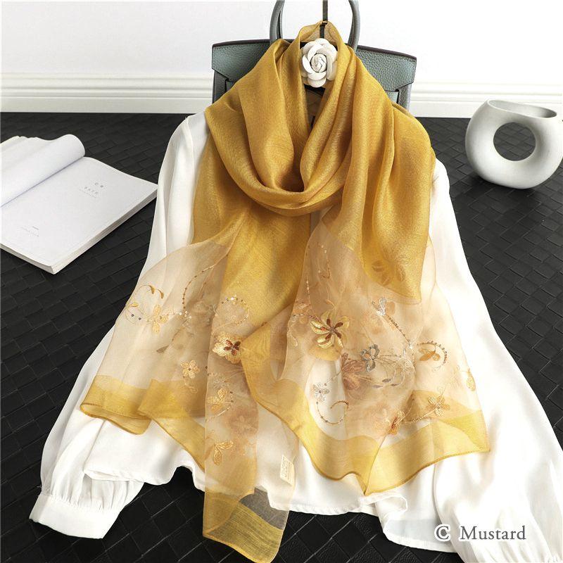 スパンコールがついたエレガントな花柄刺繍シルクウール大判ストール レディース 春 夏 春夏 秋 冬 秋冬 ショール 結婚式 ラメ ギフト プレゼント 母の日