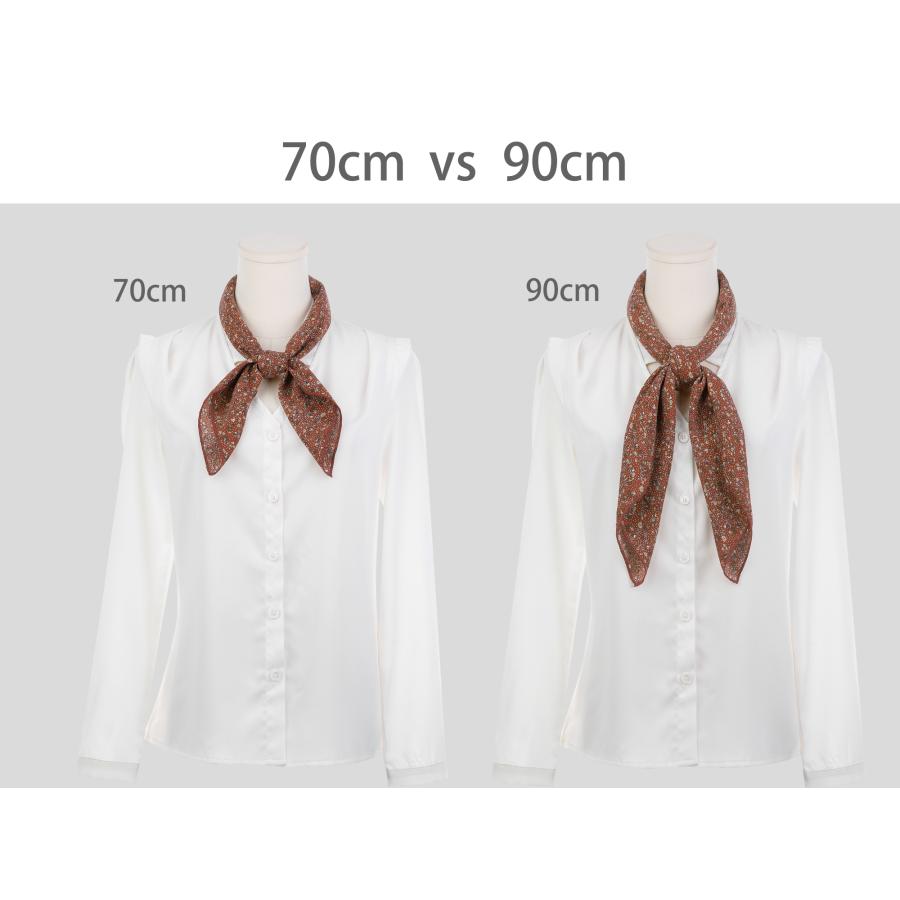 サイズ:スクエア/ロングシフォンネッカチーフは、70x70cm/27.6×27.6インチ、90x90cm/35.4×35.4インチ、140x5cm/55.1×2.0インチ、180x5cm/70.9×2.0インチの4つのサイズがあります。写真は正方形スカーフ70cmと90cmの比較、ロングスカーフ140cmと180cmのサイズ比較です。ご注文前にサイズを選択してください。