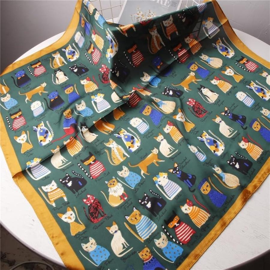 大判 きれいめ シルク調 スカーフ レディス バンダナ プレゼント 70x70cm 大判バンダナ レディース(グリーン ネコ)