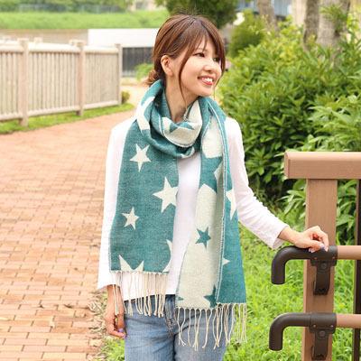 大小のスターが印象的なストールです。表裏で反対色になっているので、巻き方によって雰囲気をアレンジできます。