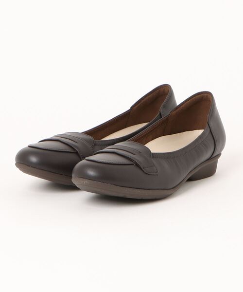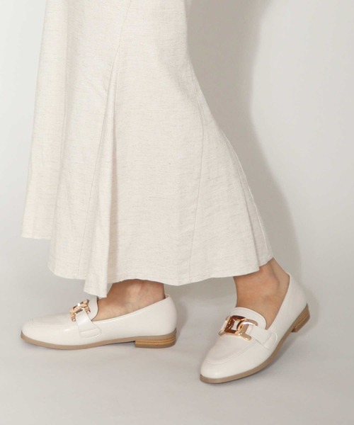 マニッシュな雰囲気漂う、シンプルに仕上げたローファー。甲の部分はゴムになっており、スリッポン感覚で脱ぎ履きしやすい。