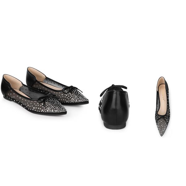 ラインストーンメッシュ、ポインテッドトゥ、ボウバックル、スリッポン、ローヒール、PU、バレエシューズ